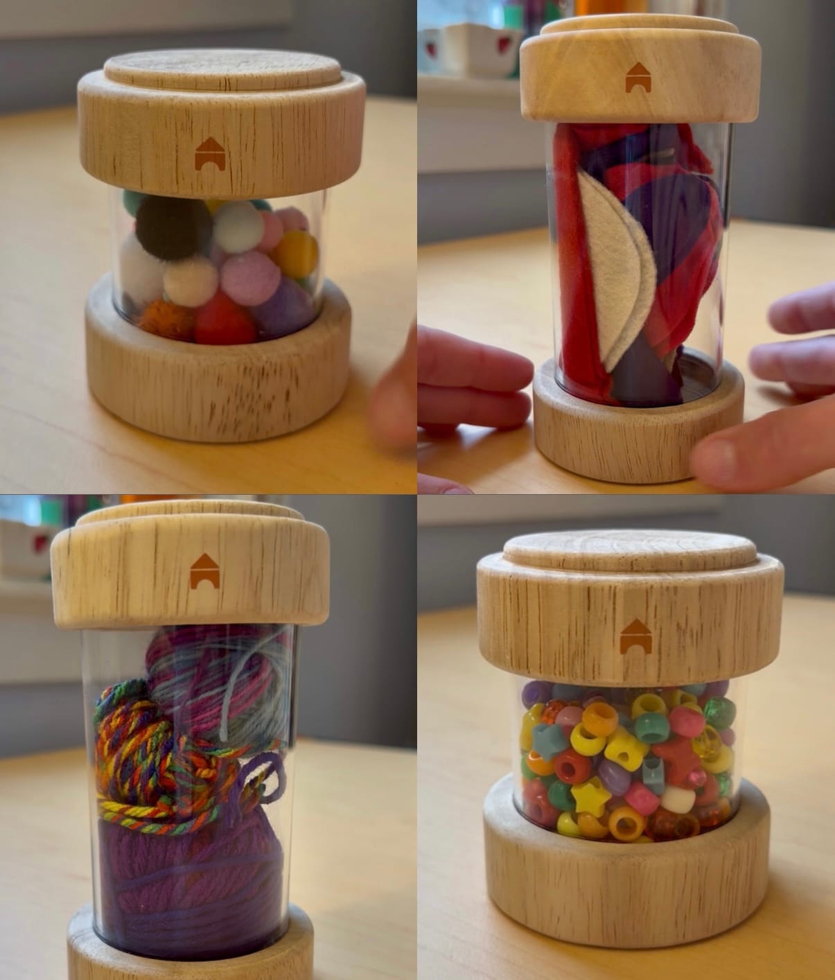 I used treasure tubes from guidecraft and filled each one with materials kids can use for simple fabric based sewing and gluing projects!